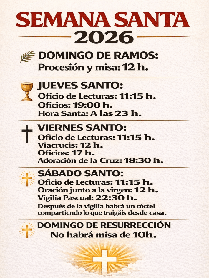 Todos los viernes de 10:00h a 13:00h en San Isidoro, donde se podrá estar con el Señor en silencio contemplativo en el rato del día que cada uno pueda. (INVIERNO)